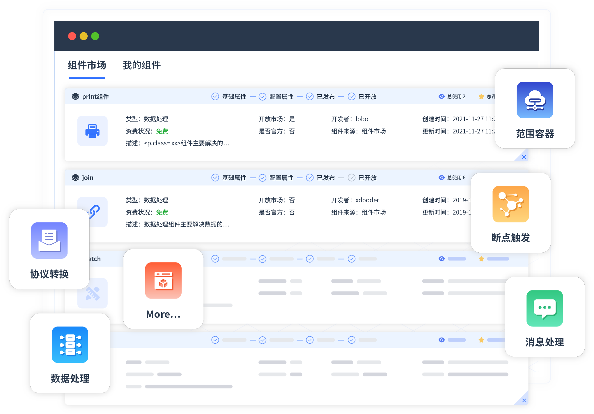 针对集成场景,,,NO钱包提供组件市场,,,例如协议转换、、、、消息处理、、、、文件操作等。。除平台提供的组件外,,,,客户可以自定义所需组件。。。。