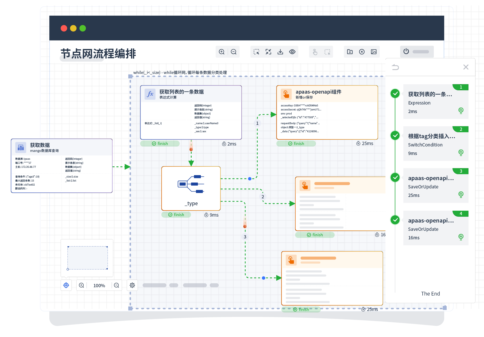 针对集成场景,,,,组件定义后支持进行流程编制,,不同于传统代码方式,,通过图形化展示,,支持在线调试、、日志查看和运行回放。。
