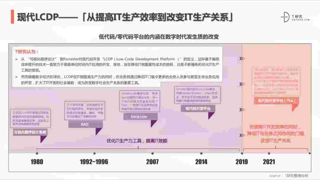 2020年前后,,,,源于提高IT工作者开发效能的LCDP不断进化和衍生,,,,面对业务导向日益明显的数字化变革。。。LCDP衍生出了面向不同对象的升级服务——面向专业人群的LCDP和业务人群的NCDP,,,LCDP与NCDP的不同服务属性被逐渐认可和接受。。。。 LCDP在提高IT开发效率的同时,,,,降低IT与业务之间协同的门槛改变IT生产关系。。。